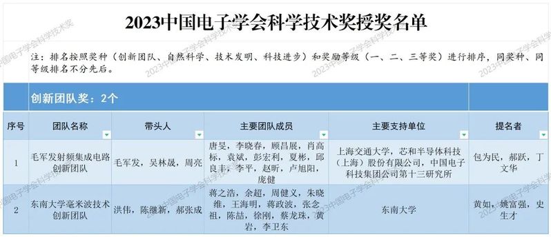 根據(jù)《中國電子學(xué)會科學(xué)技術(shù)獎管理辦法》,2023中國電子學(xué)會科學(xué)技術(shù)獎,經(jīng)評審委員會評審,獎勵工作辦公室組織公示和異議處理,報理事長批準(zhǔn),現(xiàn)將結(jié)果予以公告。2023中國電子學(xué)會科學(xué)技術(shù)獎,授創(chuàng)新團(tuán)隊獎2個;一等獎授獎項目37項,其中,自然科學(xué)獎12項,技術(shù)發(fā)明獎7項,科技進(jìn)步獎18項;二等獎授獎項目59項,其中,自然科學(xué)獎5項,技術(shù)發(fā)明獎8項,科技進(jìn)獎步46項;三等獎授獎項目51項,其中,自然科學(xué)獎7項,技術(shù)發(fā)明獎4項,科技進(jìn)步獎40項。授獎名單詳見附件。特此公告。附件:2023中國電子學(xué)會科學(xué)技術(shù)獎授獎名單中國電子學(xué)會2024年3月22日